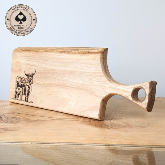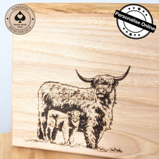 Personalised Serving Board - Elm - Highland Cow - 48cm x 16cm x 2cm